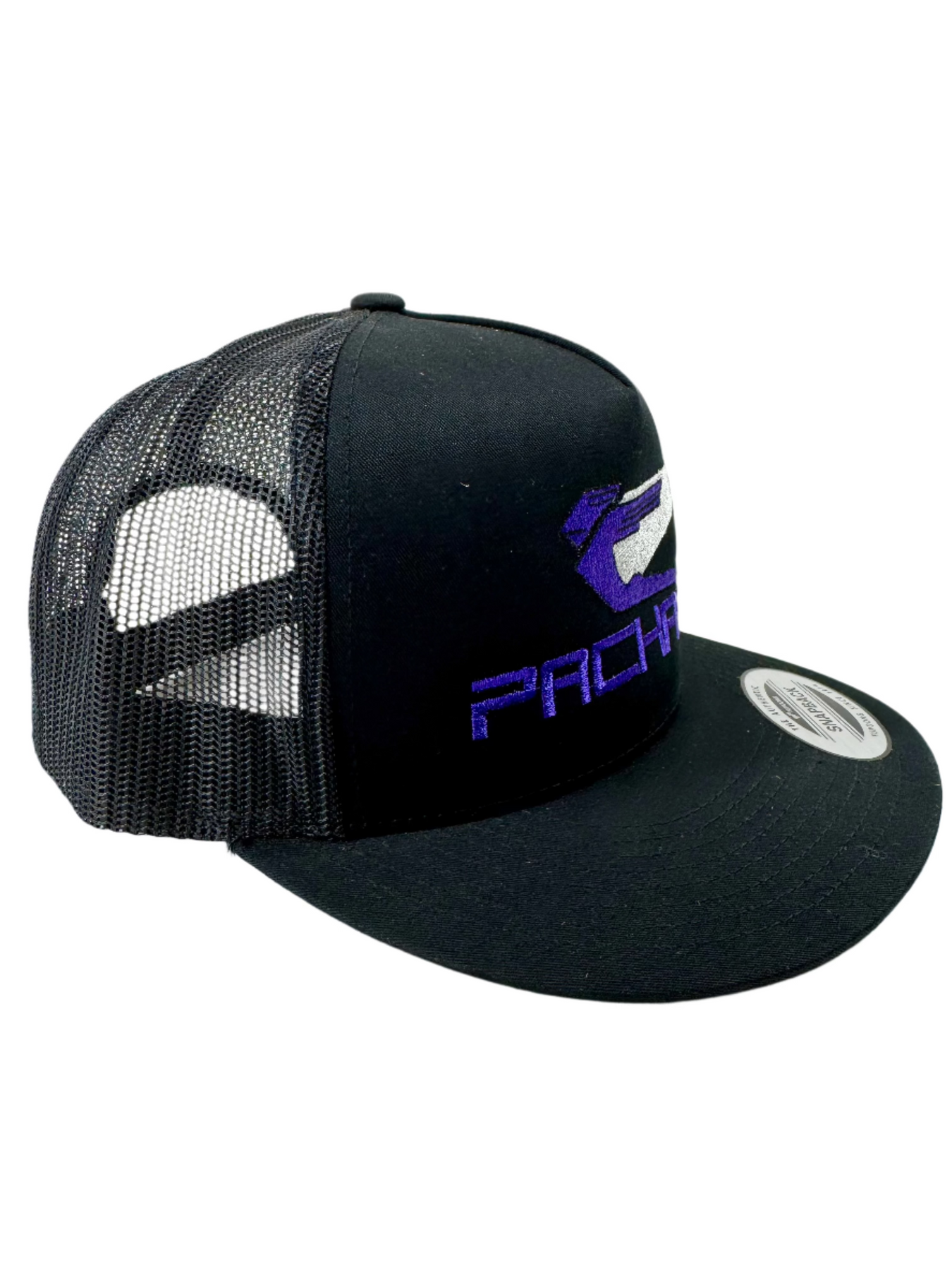 These hats are one size fits all. Trucker Style with mesh back great hat for the hot riding weather. Flat brim with purple and gray logo.
